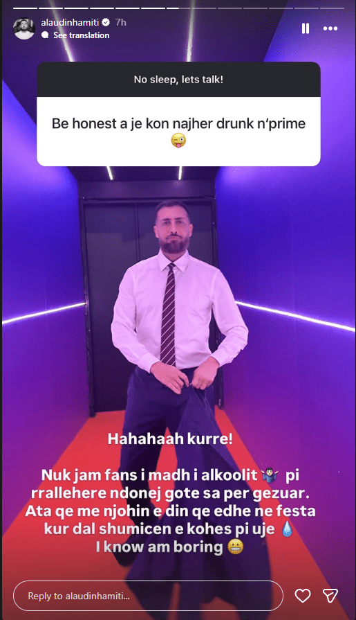 Në një InstaStory të publikuar së fundmi, ai iu përgjigj një ndjekësi që e pyeti drejtpërdrejt: “A je kon najherë drunk n’prime?”.