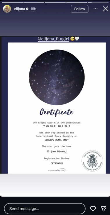 Përmes një Instastory, Elijona publikoi një certifikatë ku shihet se një fans ka “regjistruar” një yll në hapësirë me emrin e saj të plotë. Sipas dokumentit të International Space Registry, ylli me koordinata specifike tashmë mban emrin “Elijona Binakaj”.