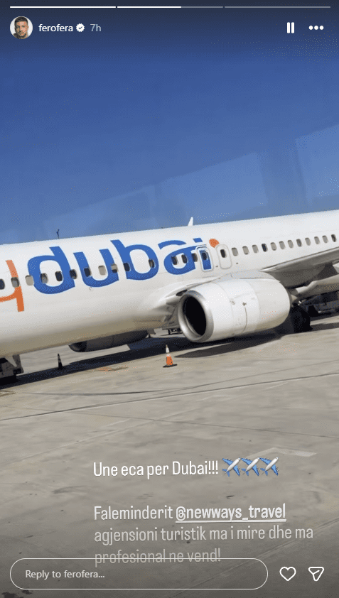 Reperi Fero ka zbuluar përmes një InstaStory se ka marrë rrugën drejt Dubait. Ai publikoi një fotografi nga pista e aeroportit, duke konfirmuar nisjen e udhëtimit, por pa dhënë shumë detaje mbi arsyen.