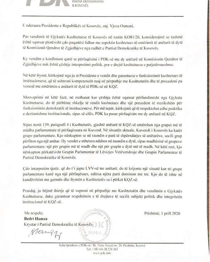Në këtë letër, Hamza thekson se vendimi i Gjykatës Kushtetuese të Kosovës në rastin KO81/26 ka sqaruar përfundimisht çdo paqartësi lidhur me këtë çështje, duke konfirmuar se përfaqësimi i PDK-së me dy anëtarë në KQZ është një e drejtë kushtetuese dhe jo çështje interpretimi politik.