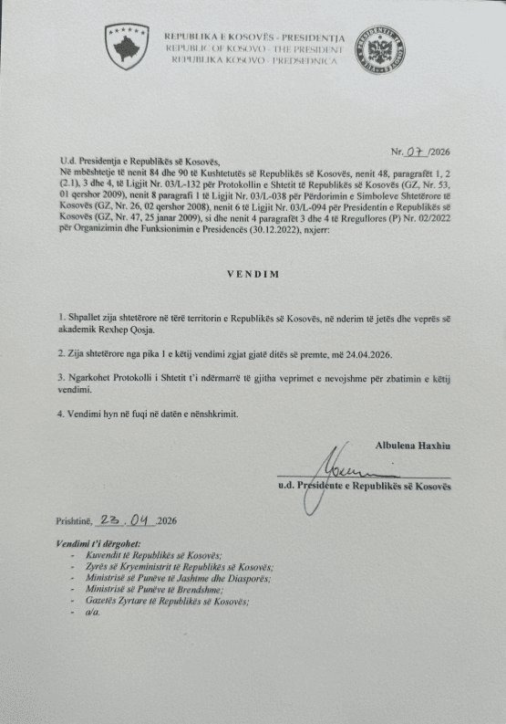 Ushtruesja e Detyrës së Presidentes së Republikës së Kosovës, Albulena Haxhiu, ka vendosur që dita e premte, 24 prill 2026, të shpallet Ditë zie shtetërore në Kosova.