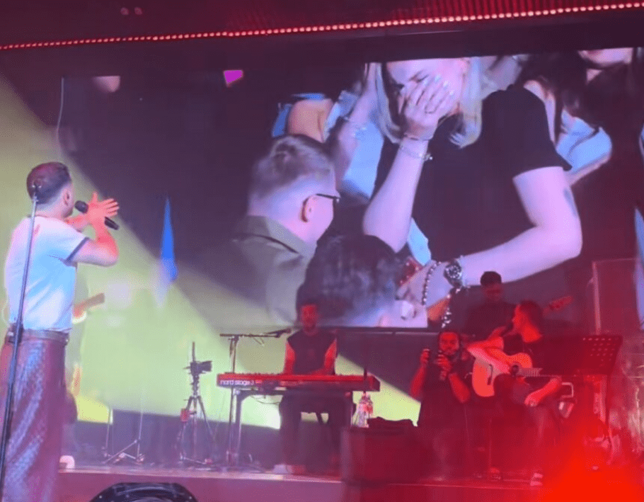 Megjithatë, një moment i papritur mori gjithë vëmendjen e mbrëmjes. Në mes të koncertit, një i ri u ul në gjunjë dhe i propozoi partneres së tij për martesë, duke surprizuar jo vetëm vajzën, por edhe të gjithë të pranishmit.