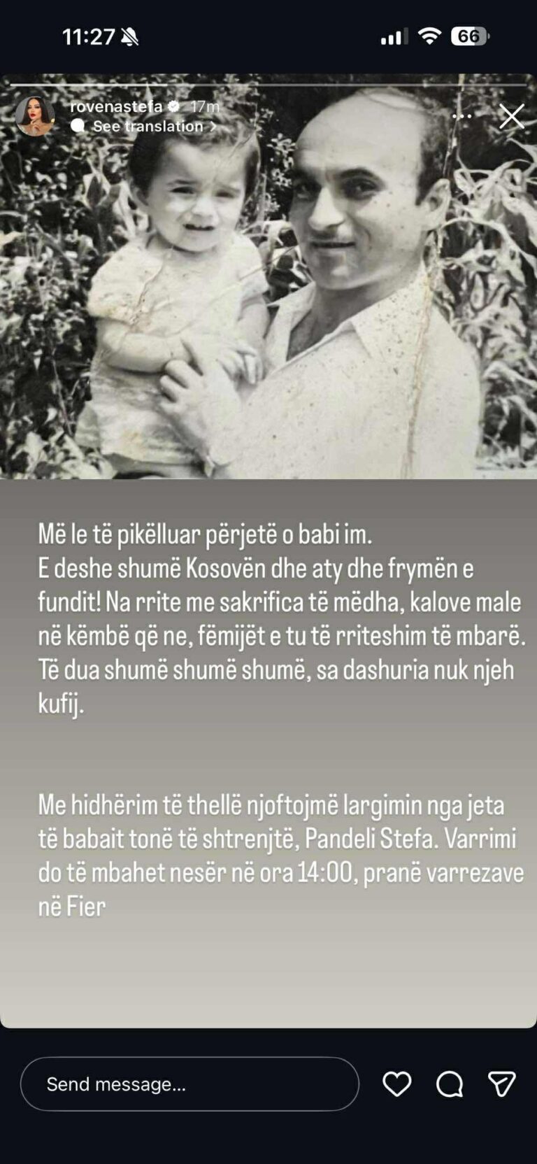 Këngëtarja Rovena Stefa ka ndarë me ndjekësit lajmin e hidhur për ndarjen nga jeta të babait të saj, Pandeli Stefa.