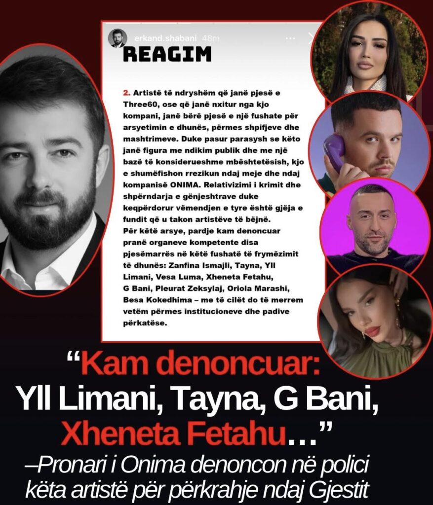 Një përplasje e fortë ka shpërthyer në skenën e muzikës shqiptare pasi përfaqësues të Onima kanë bërë të ditur se kanë denoncuar në polici disa artistë të njohur, duke i akuzuar për përkrahje ndaj Gjesti dhe për përhapje të deklaratave që, sipas tyre, nxisin dhunë dhe dezinformim.
